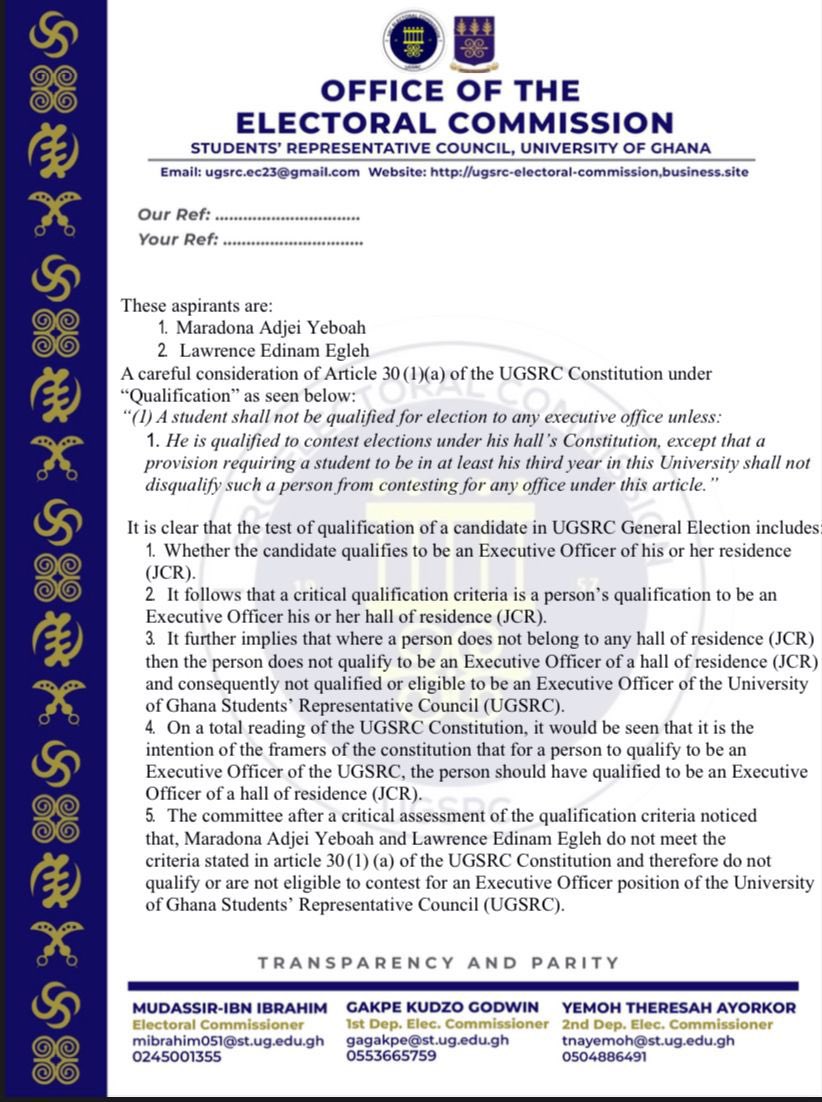 The constitution also states that a person who does not reside in any of the university’s halls shall not qualify for a leadership position. The committee concluded: “The committee after a critical assessment of the qualification criteria, noticed that Maradona Adjei Yeboah and Lawrence Edinam Egleh do not meet the criteria stated in Article 30 (1) (a) of the UG-SRC Constitution and therefore do not qualify or are not eligible to contest for an Executive Officer position of the University of Ghana Students’ Representative Council (UGSRC).”