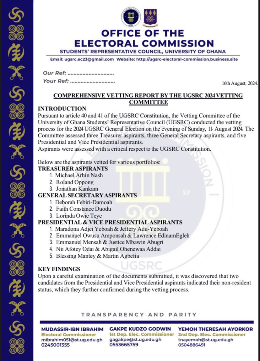 The report revealed that Guru (Maradona Adjei Yeboah) and Lawrence Edinam Egleh are non-residential students, making them ineligible to contest the election. According to the UG SRC Constitution: “A student shall not be qualified to any executive office unless: he is qualified to contest under his hall’s constitution, except that a provision requiring a student to be in at least his third year in this University shall not disqualify such a person from contesting for any office under this article.”